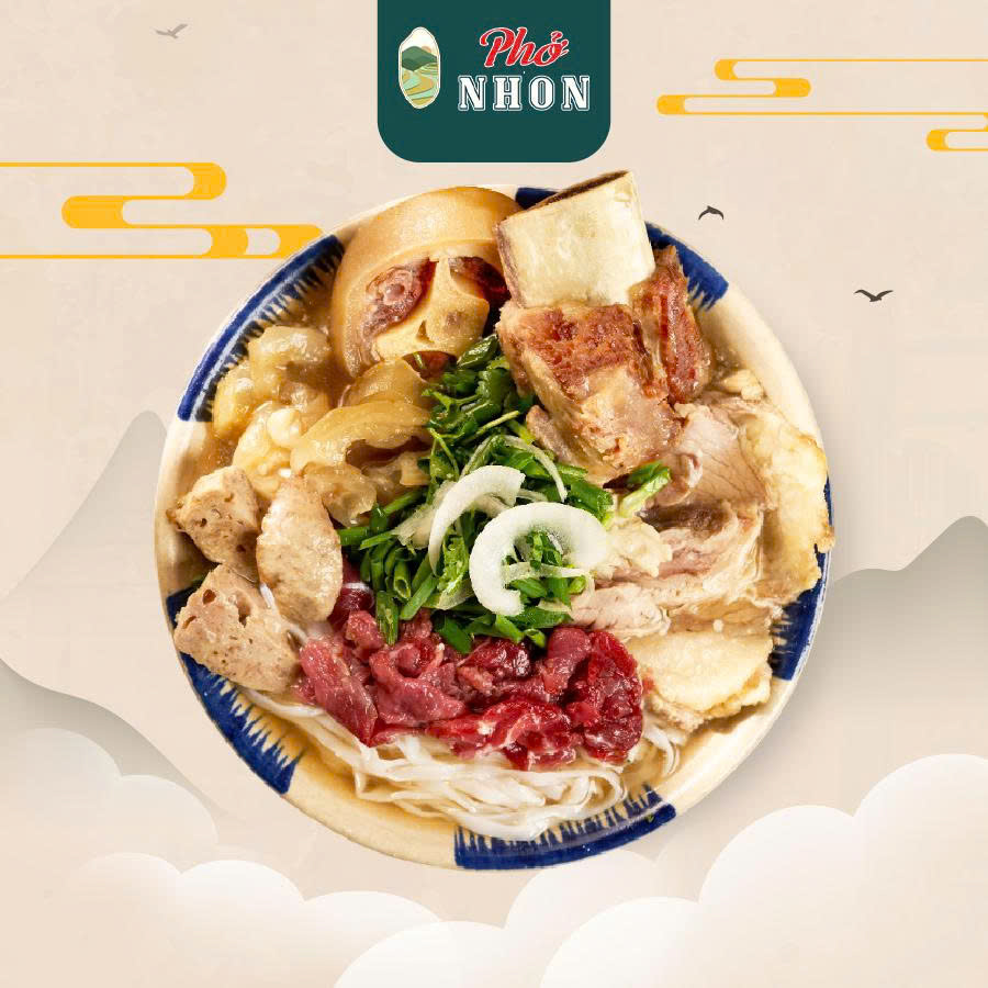 Tô phở bò tại Phở Nhon là sự kết hợp tinh tế giữa nước dùng trong, ngọt thanh từ xương gà hầm kỹ nhiều giờ và từng thớ thịt gà ta dai mềm, thơm đậm vị. Sợi phở mỏng vừa, thấm đều nước dùng, điểm thêm chút hành hoa, lá chanh thái nhuyễn